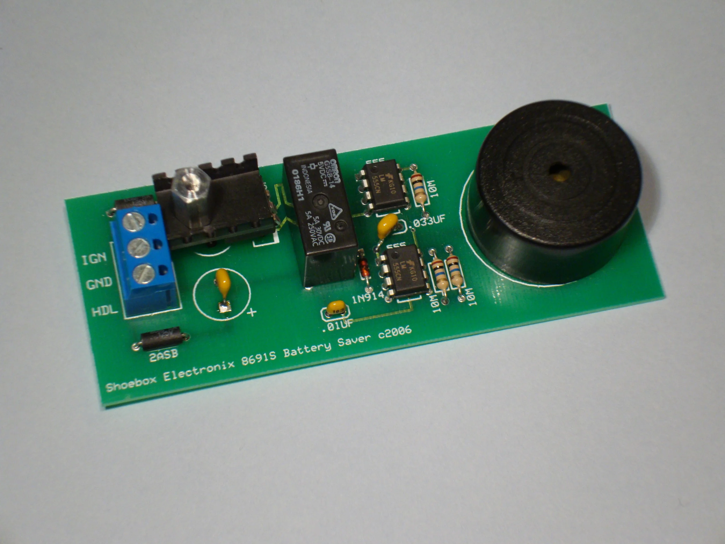 The 8591B Battery Saver Kit is supplied with an assembled and tested circuit board ready to install in your Vanagon. How many times have you forgotten to switch your headlight switch OFF when you left your Vanagon parked for an extended period, only to return to a dead battery? The "Bat Saver" will remind you to click that headlight switch OFF with a pulsing ten second audible alarm. After that it assumes that you want to leave the lights on for some reason, and shuts off. Convienient if you drive in with your lights on for safety reasons, rain, or fog, when the lights are difficult to see from outside your van. The board mounts just under the instrument cluster cover on your speedometer housing. Three wires, prepared with the necessary connectors are included, and connect the Battery Saver to your headlight switch and one ground screw, making the installation straight forward. The circuit is isolated from your wiring with two 5A FB fuses, and a 7805 regulator. All required connector, splices, and wires are included for you to install on all Vanagons. Detailed instructions cover both 1985 and 1986 - 91 models. Pick up one of these neat kits, and forget "Headlight Switch Headache".